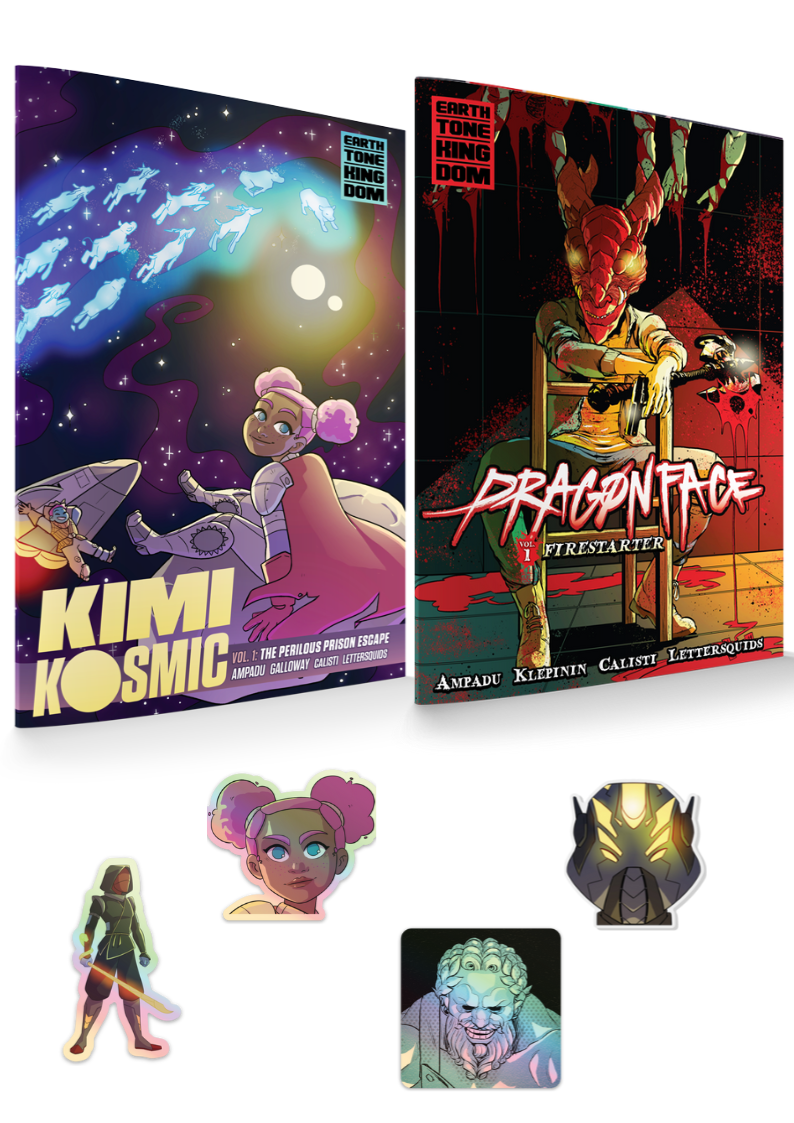 - 2 KIMI KOSMIC or DRAGONFACE STICKER or ENAMEL PIN (randomly selected based on supply